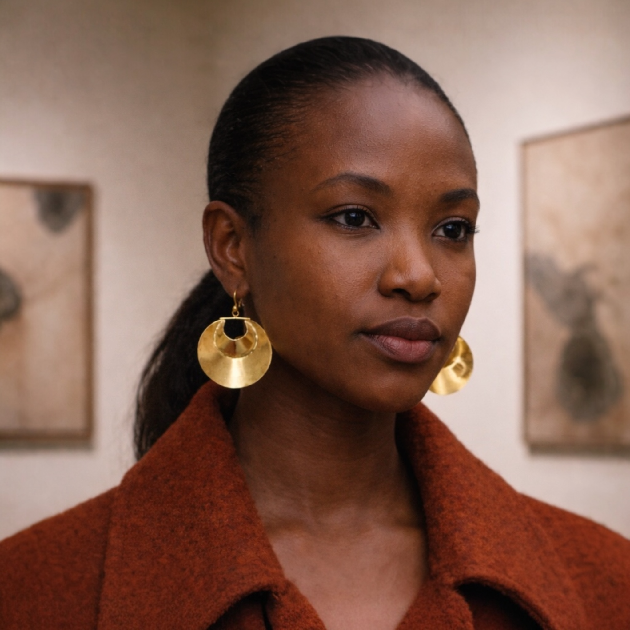 - Produktbeskrivelse: Zani-øredobbene er formet av lagdelte, håndhamrede messingplater som fanger lys med myk, skulpturell bevegelse.