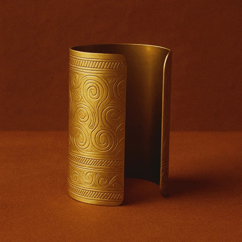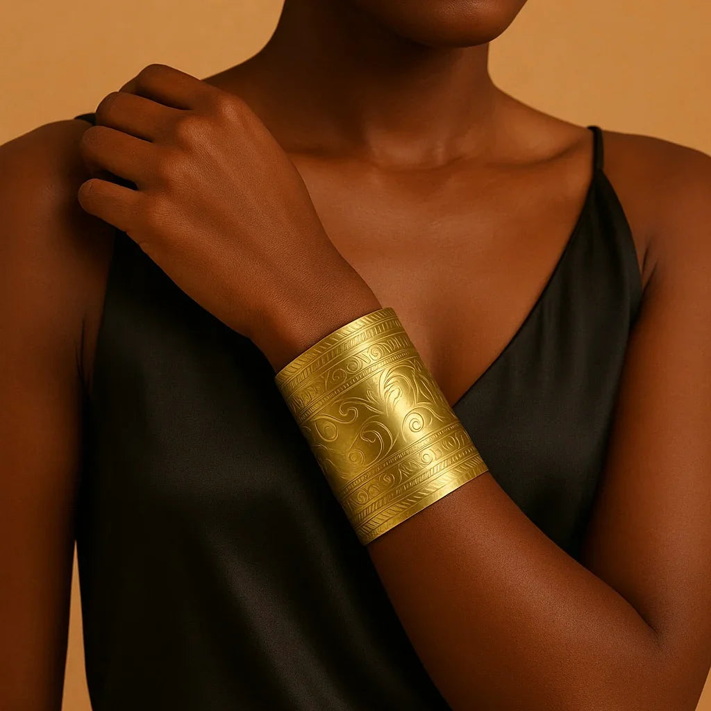 - Product Description: Let your style speak boldly with the Zanbé bracelet – a wide, engraved brass cuff that radiates strength and elegance. Handcrafted with swirling motifs inspired by West African art, this piece captures the glow of tradition in every etched detail. Lightweight yet striking, it’s made to stand out without weighing you down.