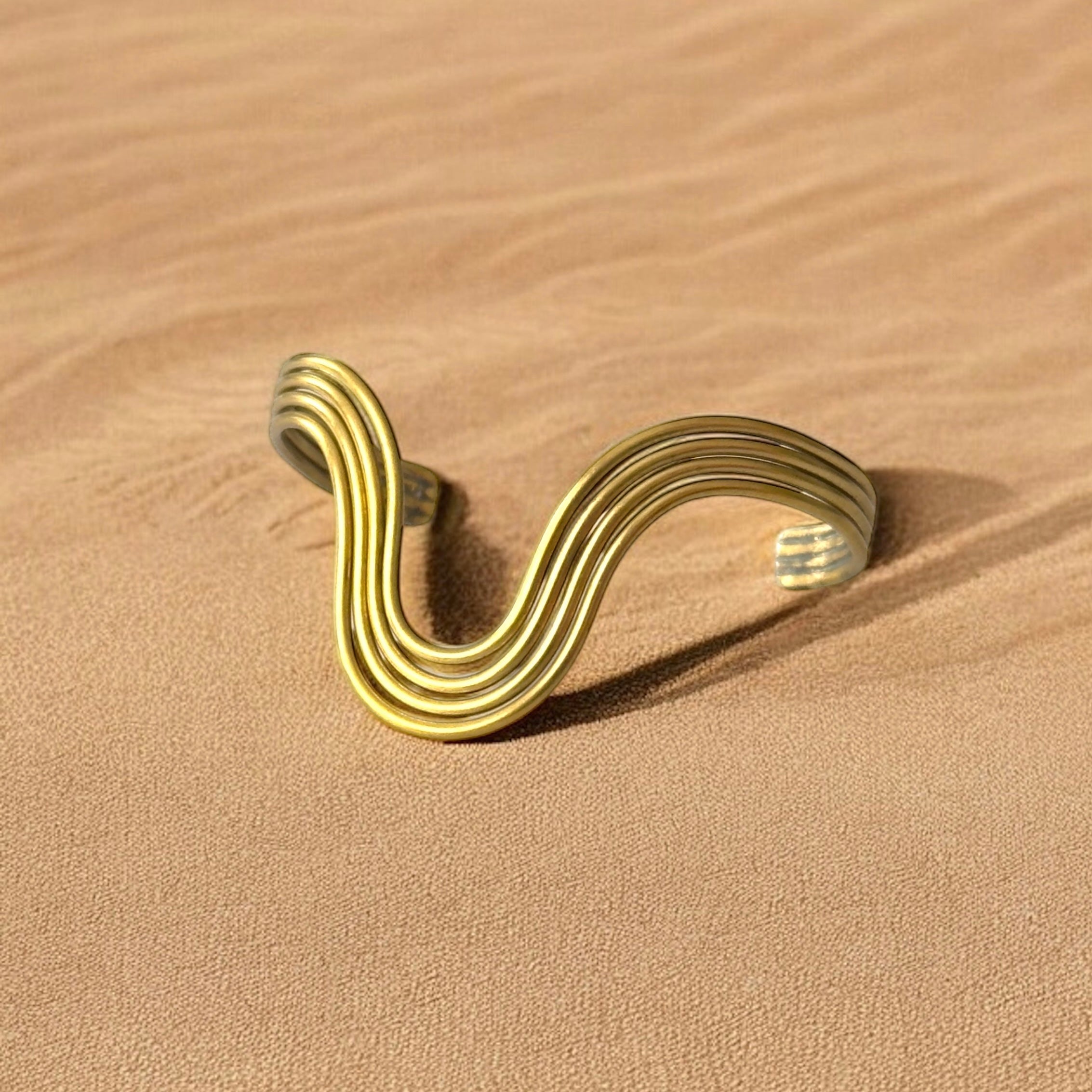 - Description: The Bina Bracelet captures the rhythm of waves in hand-shaped brass lines that flow with effortless grace. Its undulating form wraps gently around the wrist, blending movement and stillness in a single statement.