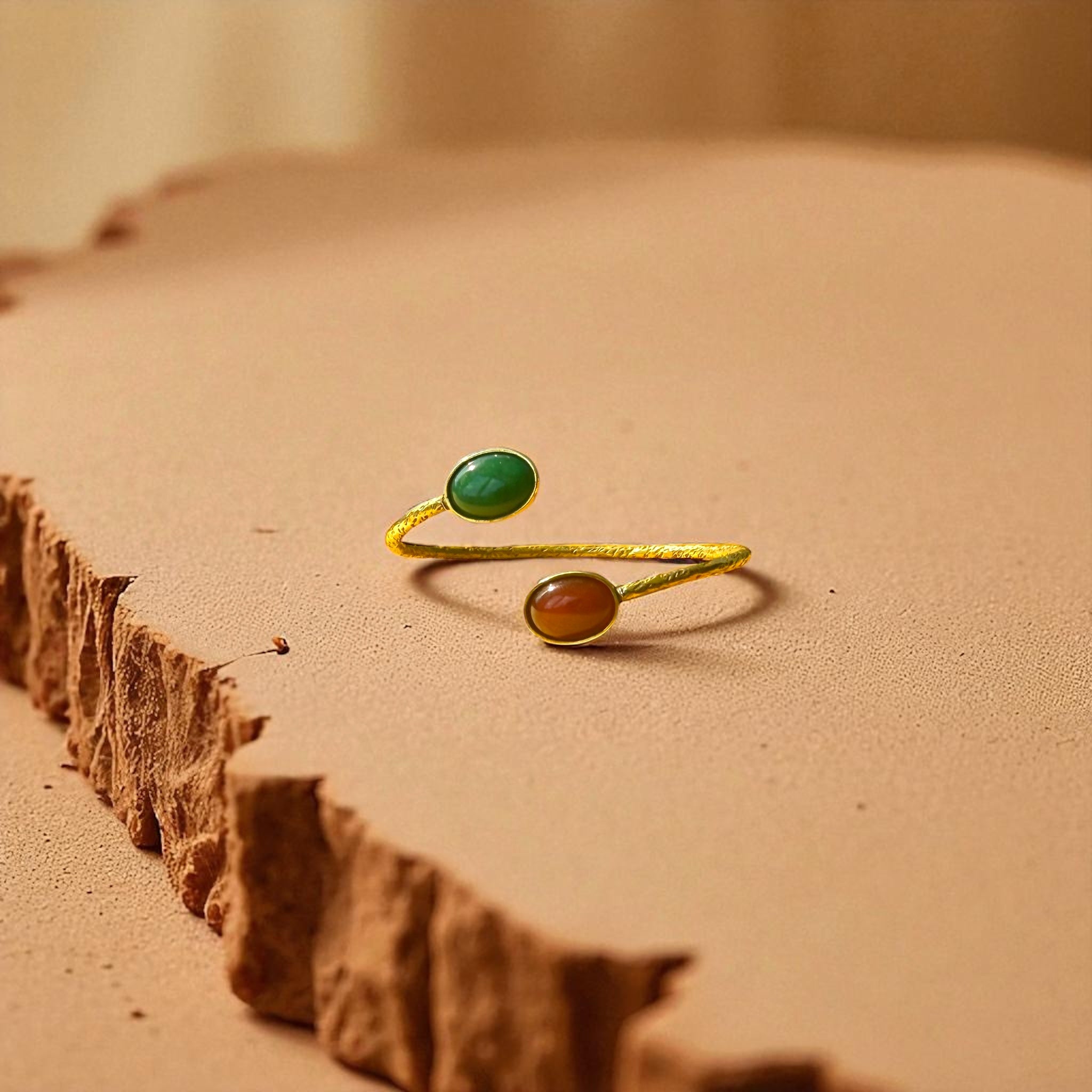 - Product Description: Open brass ring with two polished stones in contrasting colors for a balanced, modern look. Designed in Oslo, handcrafted in Senegal.