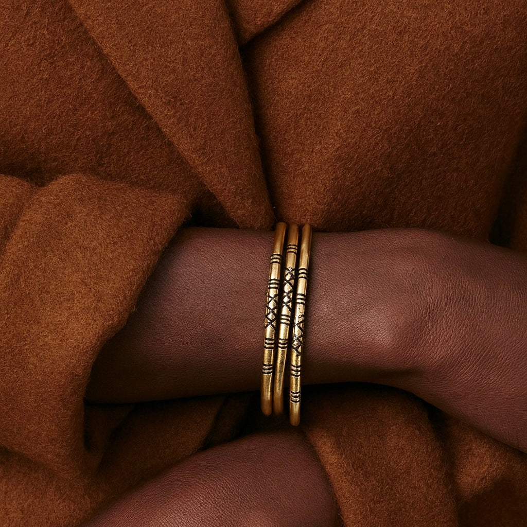 - Product Description: Inspired by traditional West African arm jewelry, each bangle carries etched patterns that echo centuries of craftsmanship. Lightweight and stackable, they shine alone or together