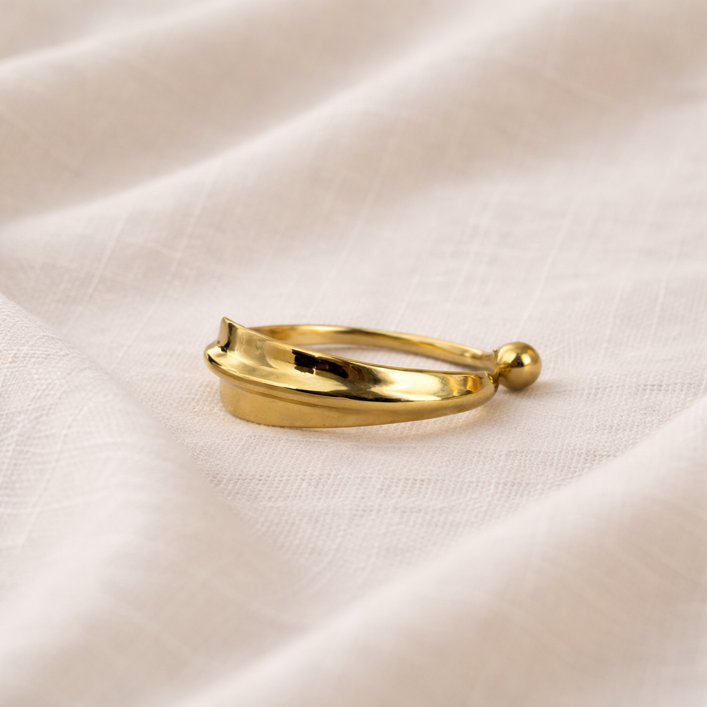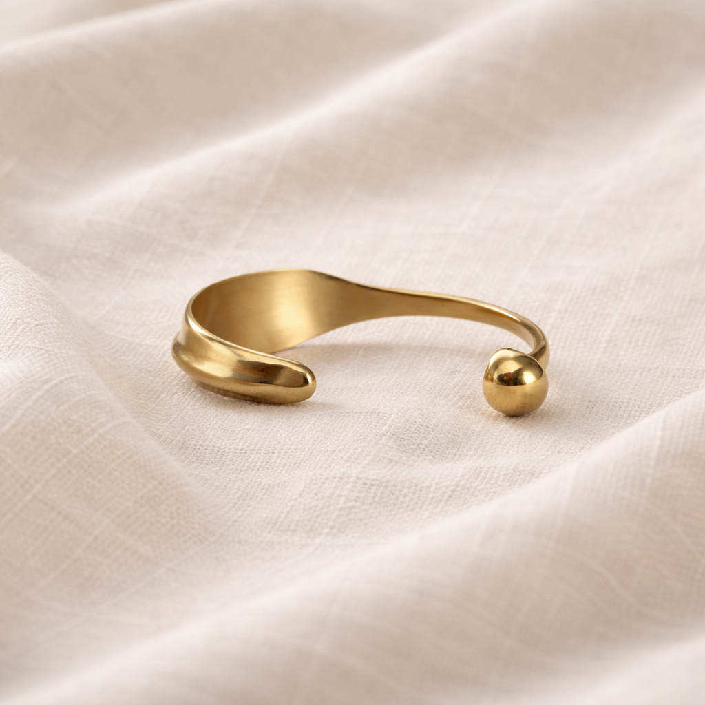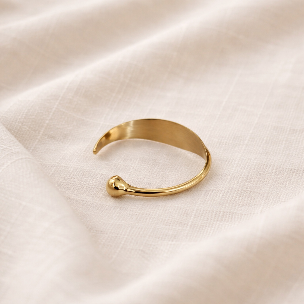 - Product Description: A sculptural open cuff inspired by the gentle curve of a leaf, ending in a rounded form that reflects natural growth and flow. It sits lightly on the wrist, adding a refined, grounded presence to your everyday look.