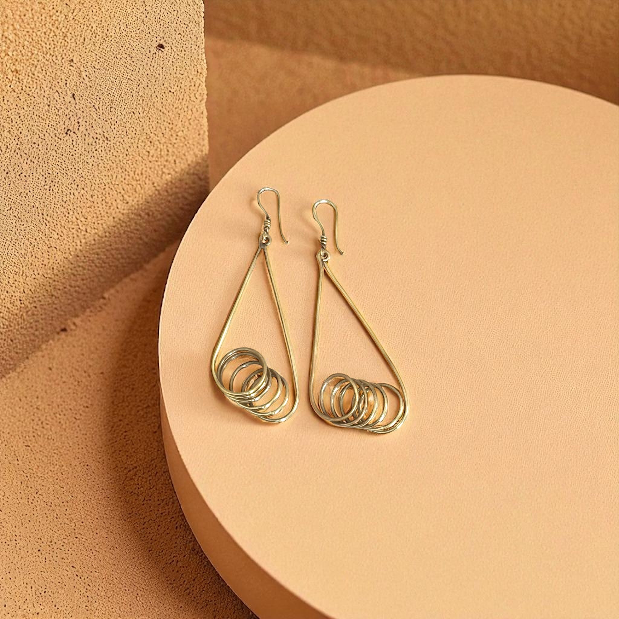 - Product Description: Lightweight drop earrings with a minimalist frame and stacked brass loops for subtle movement. Designed in Oslo, handcrafted in Senegal