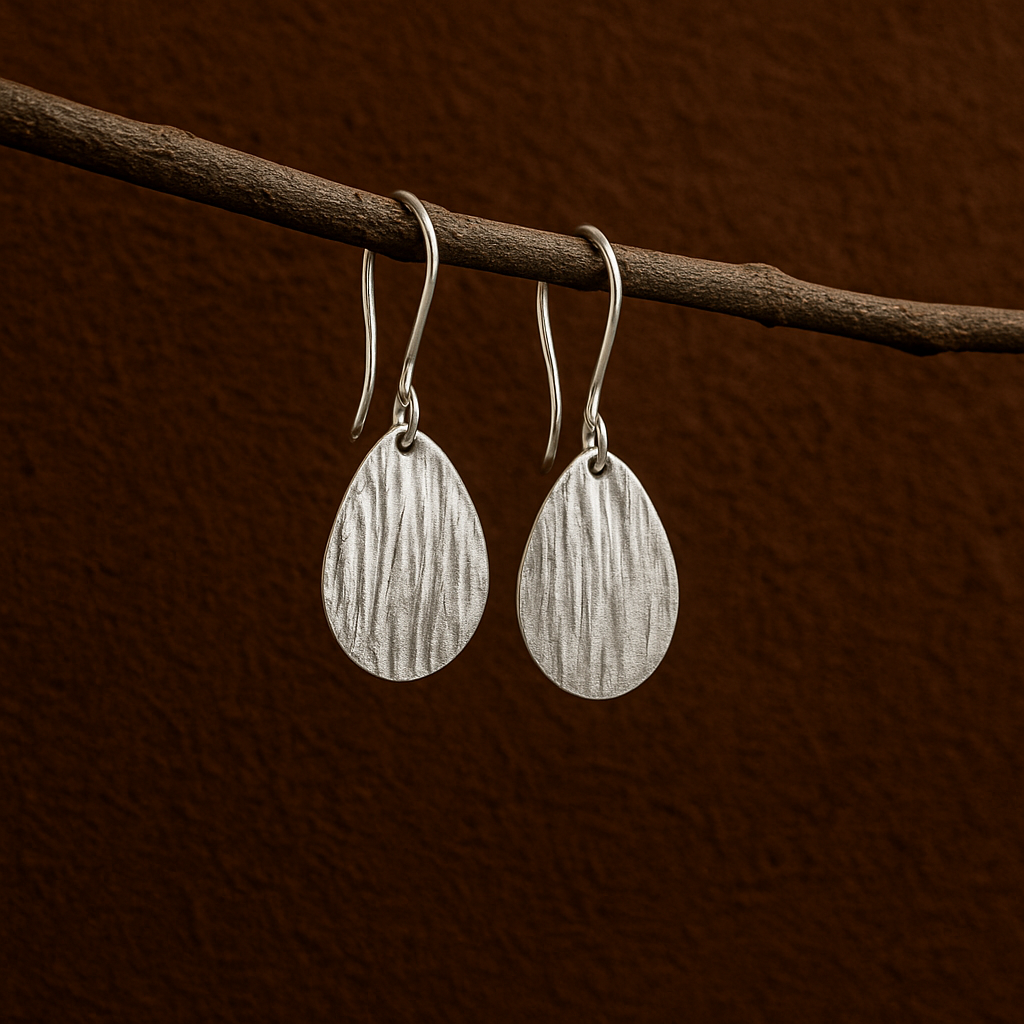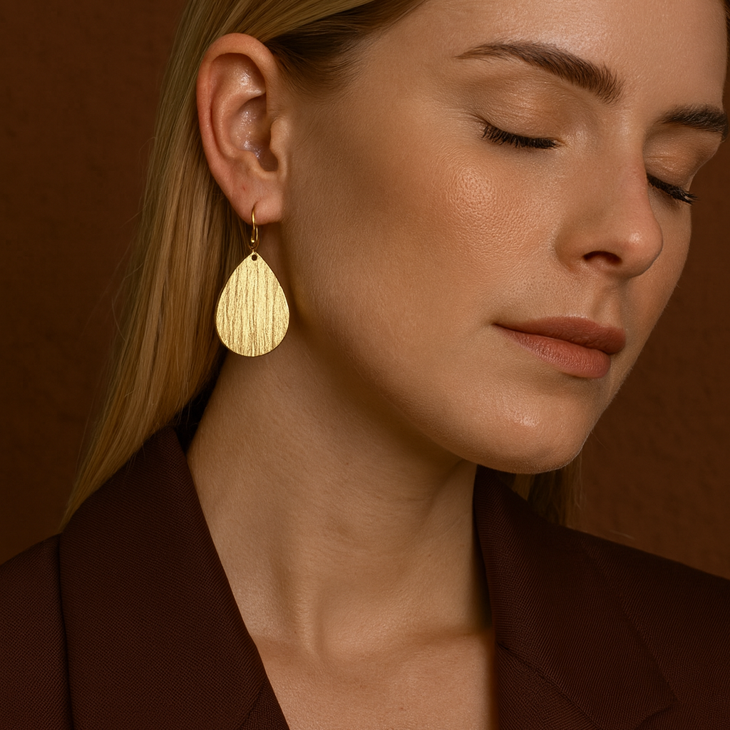 • Product Description: Textured teardrop earrings in brass with a hammered finish that reflects light beautifully. Lightweight and comfortable, they add a natural glow to your style.