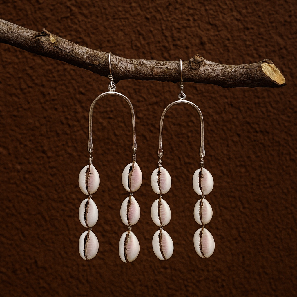 Product Description: Long brass earrings with cowrie shells, combining elegance with cultural symbolism. Lightweight and comfortable, they frame the face with natural movement.