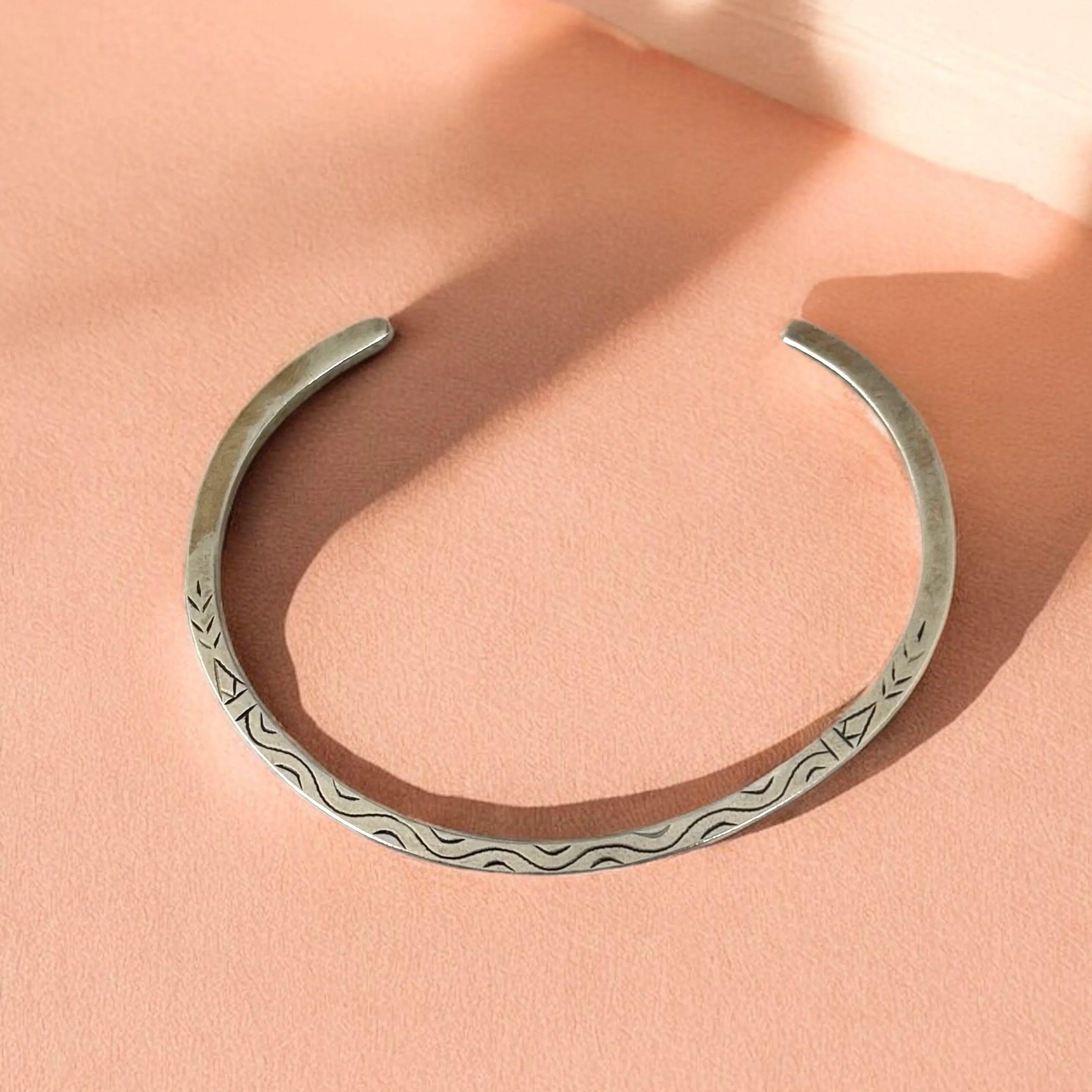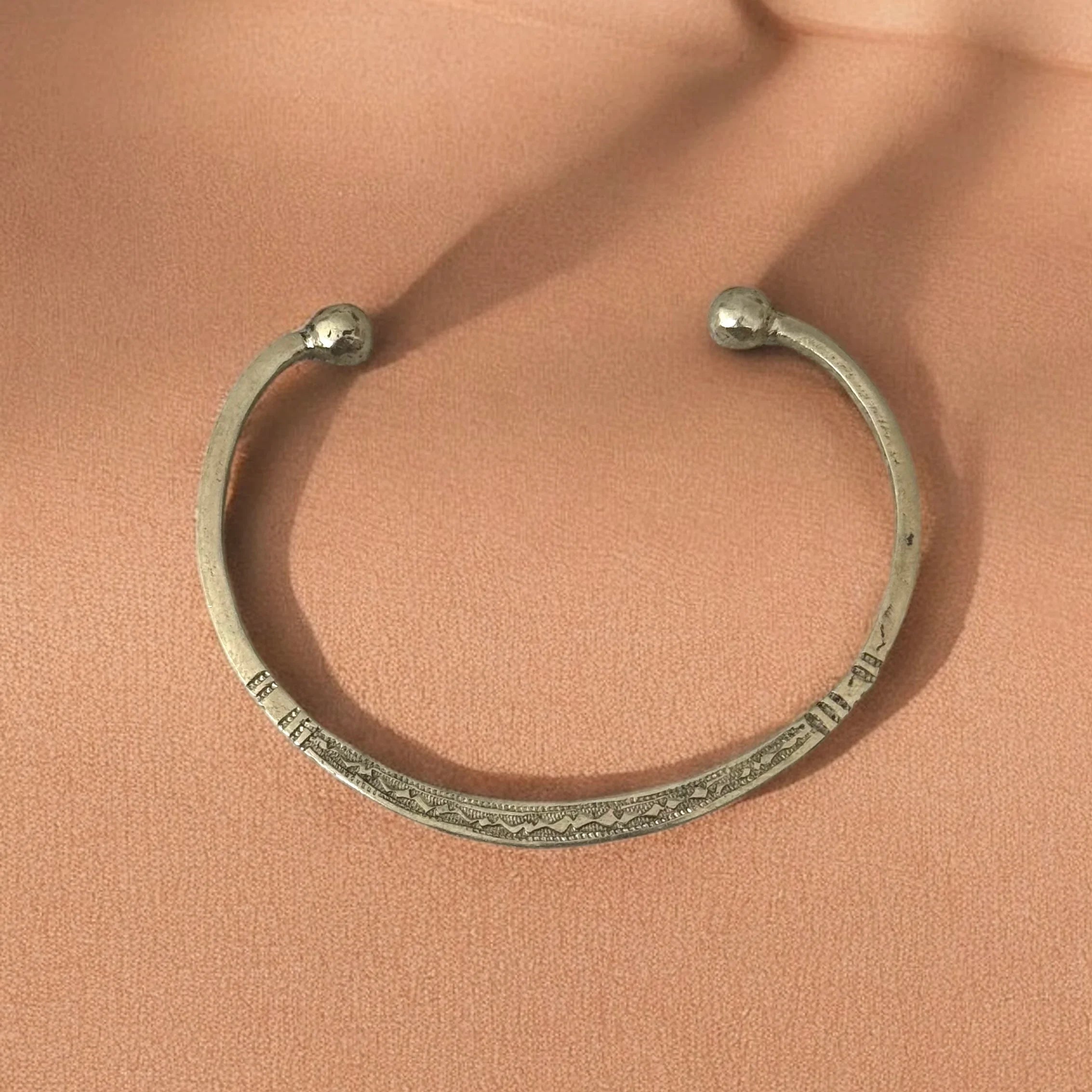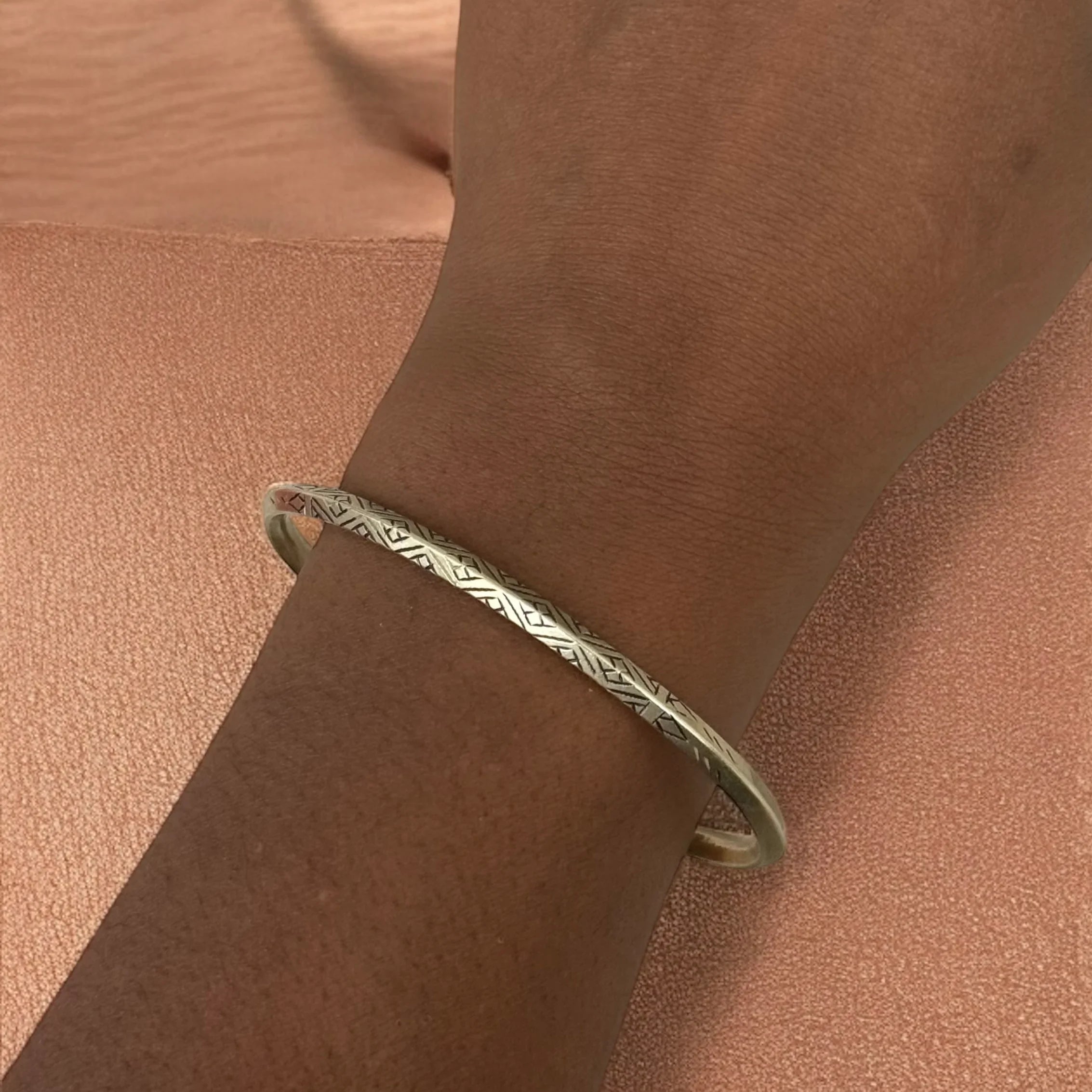 - Description du produit : Ce bracelet en métal gravé s'inspire de l'artisanat berbère, avec ses motifs délicats porteurs de symboles transmis de génération en génération. Léger et facile à porter, Tilleli est une pièce intemporelle qui honore la liberté, l'identité et l'héritage. Pas de problème de taille ! Ce bracelet s'ajuste parfaitement à votre poignet.