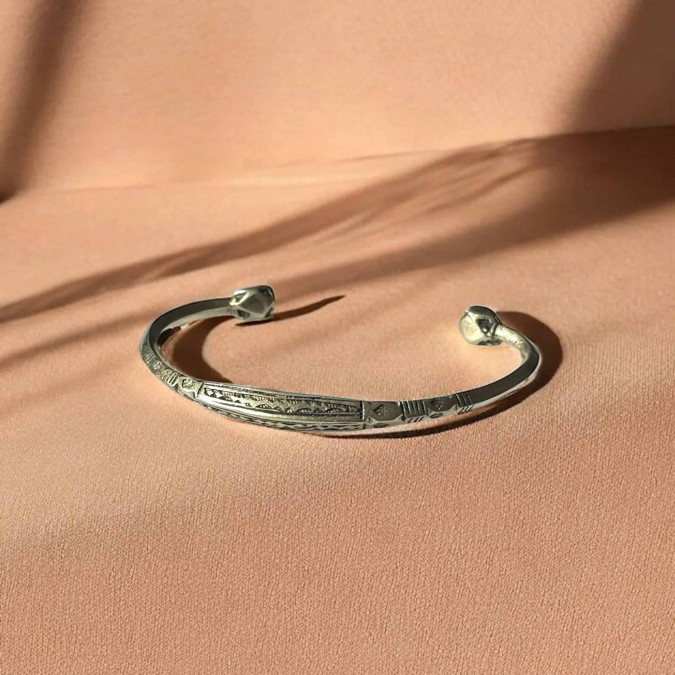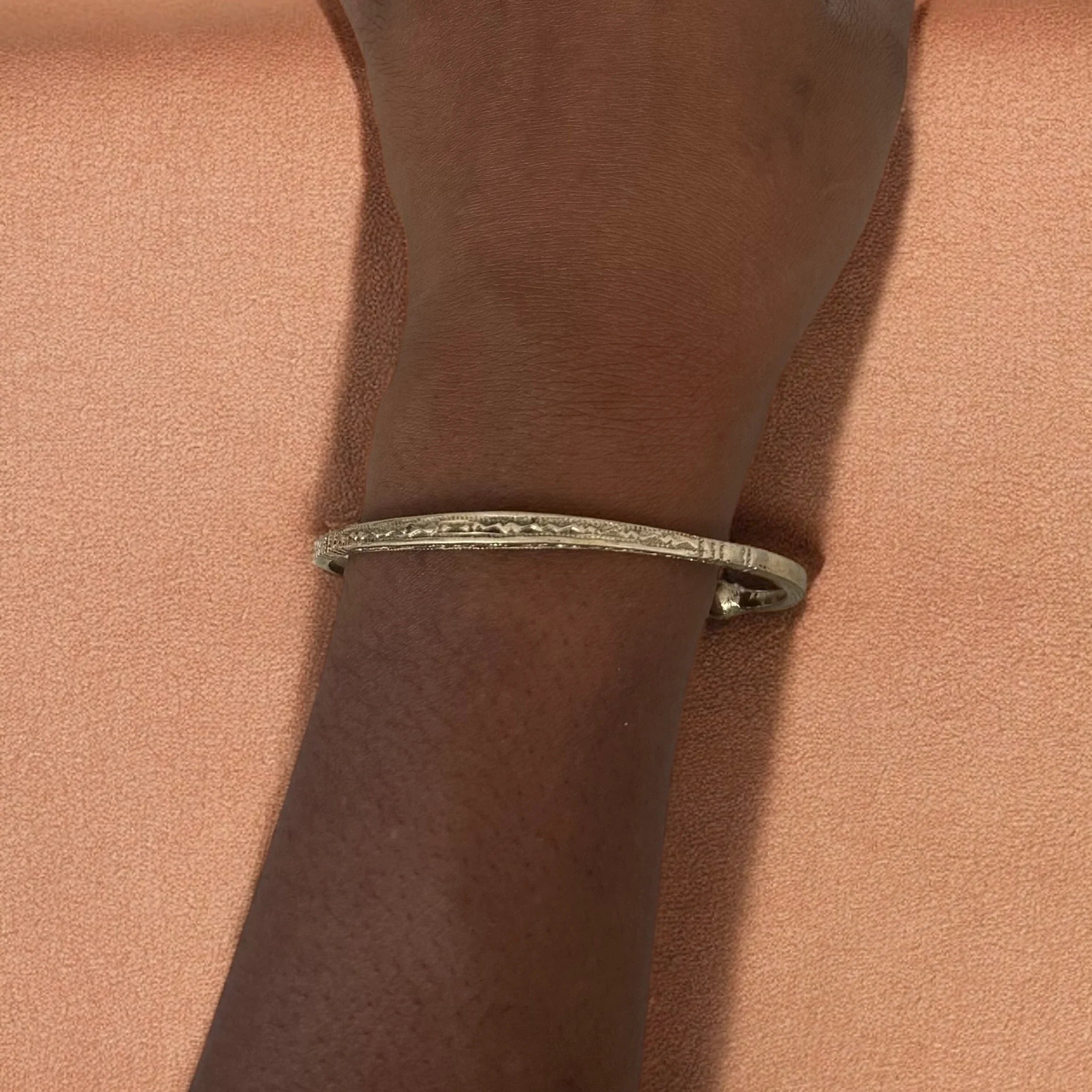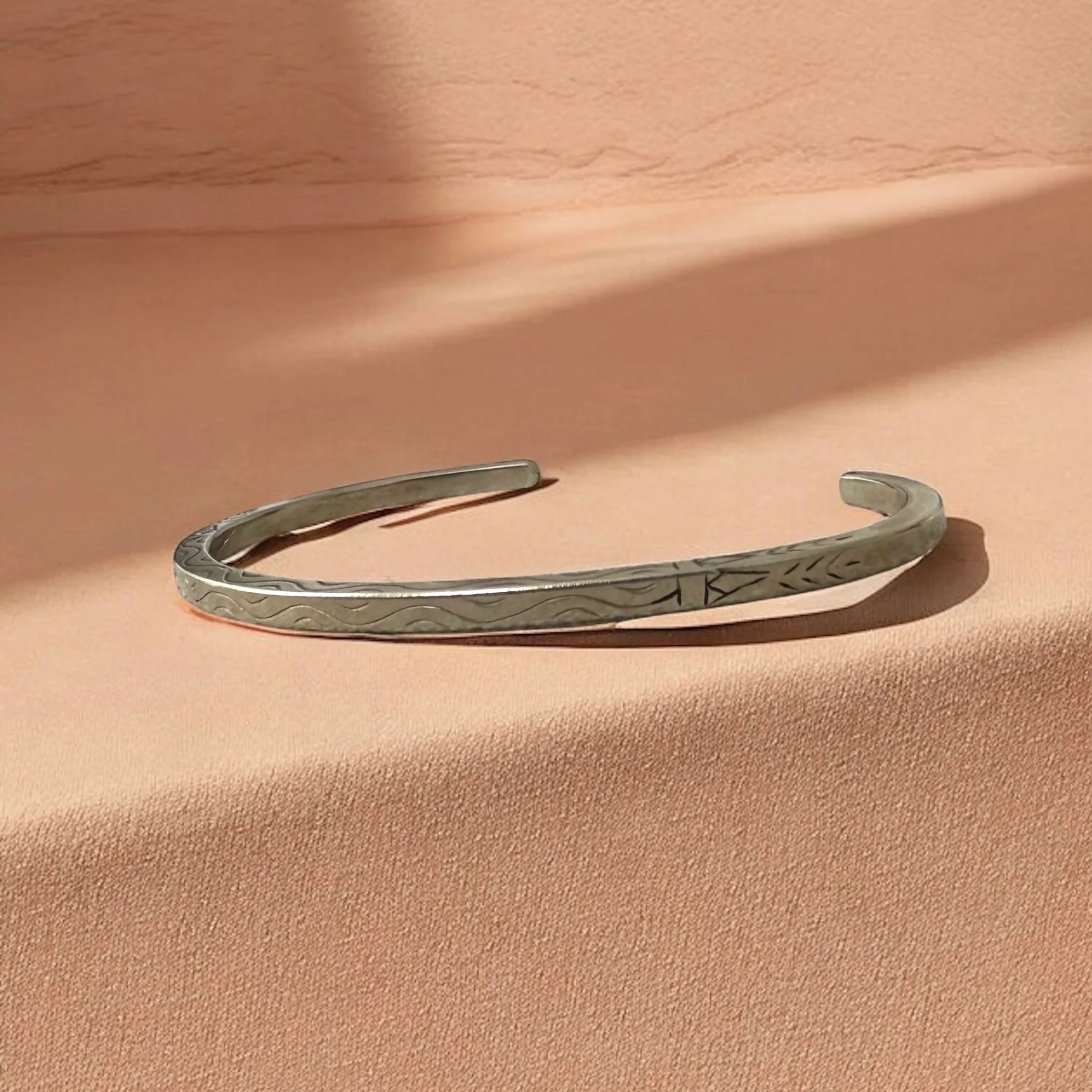 - Description du produit : Ce bracelet en métal gravé s'inspire de l'artisanat berbère, avec ses motifs délicats porteurs de symboles transmis de génération en génération. Léger et facile à porter, Tilleli est une pièce intemporelle qui honore la liberté, l'identité et l'héritage. Pas de problème de taille ! Ce bracelet s'ajuste parfaitement à votre poignet.