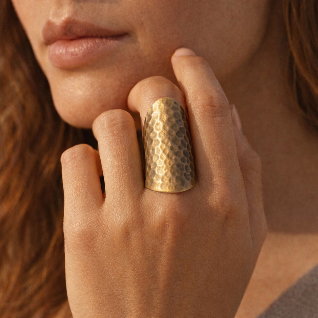 - Description du produit : Cette large bague en cuivre martelé vous impressionnera avant même que vous ne disiez un mot. Sa forme sculpturale enveloppe votre doigt d'une élégance audacieuse, tout en étant suffisamment légère pour un confort quotidien.