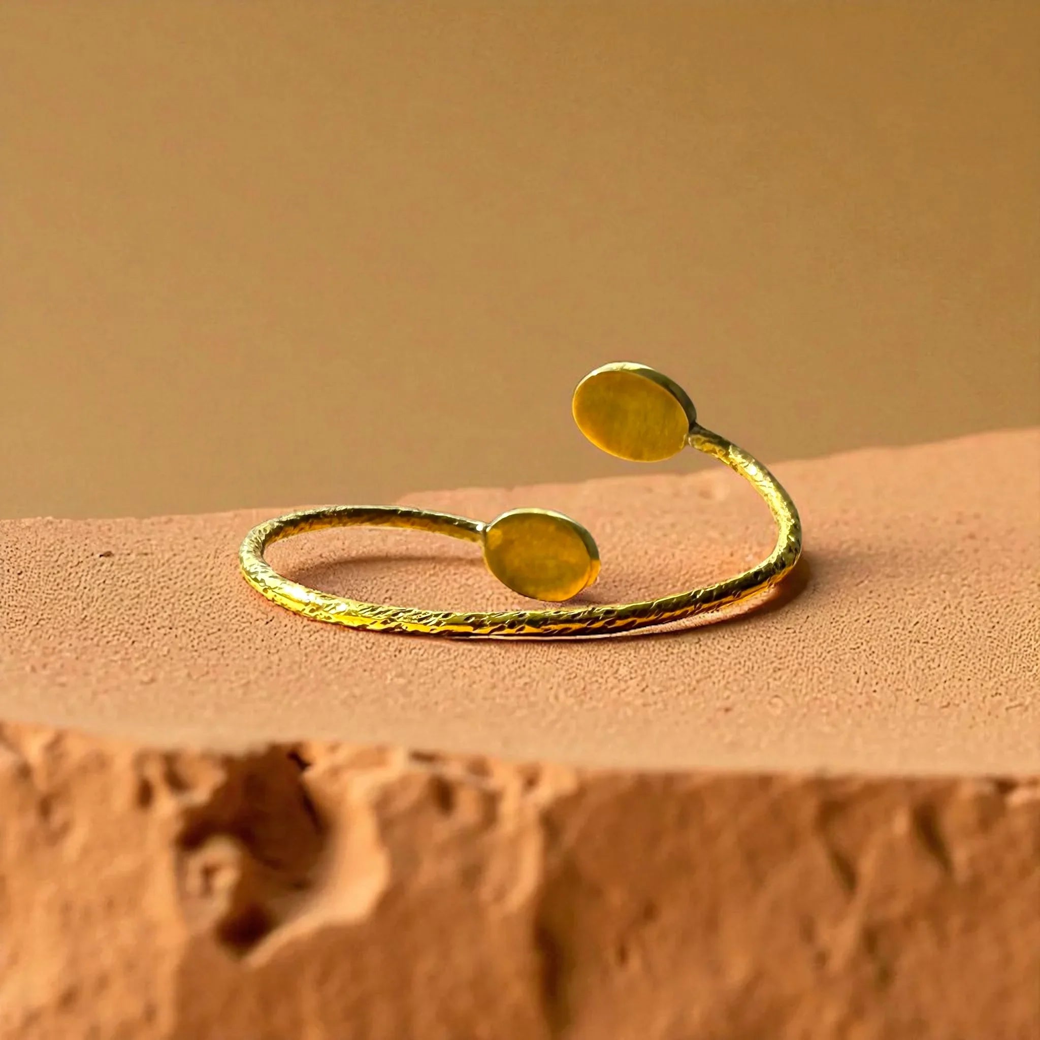 - Produktbeskrivelse: Åpen messingring med to polerte steiner i kontrastfarger for et balansert, moderne utseende. Designet i Oslo, håndlaget i Senegal.