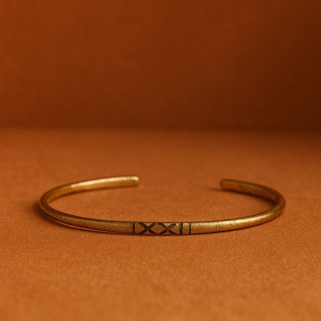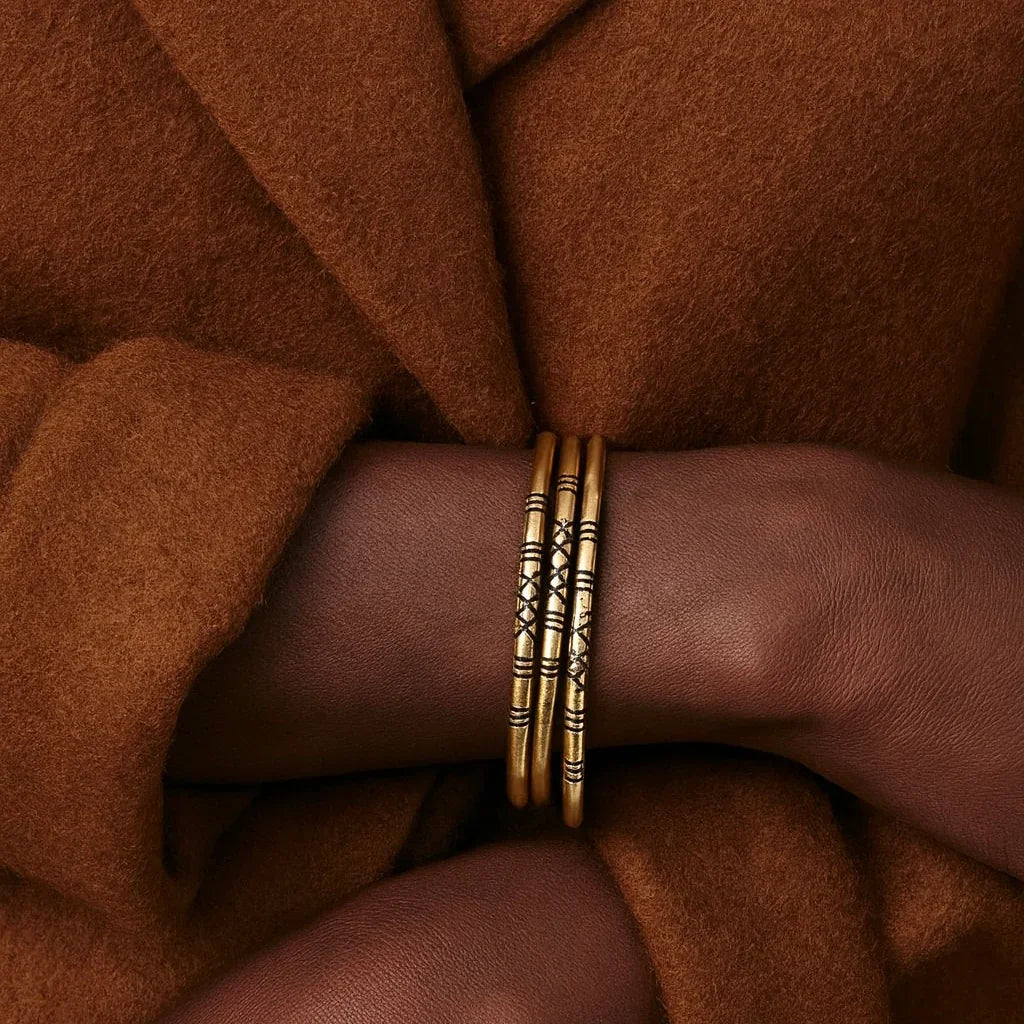 - Produktbeskrivelse : Inspirert av tradisjonelle vestafrikanske armbåndsmykker, har hver armring etsete mønstre som gjenspeiler århundrer med håndverk. De er lette og stablebare, og skinner alene eller sammen.