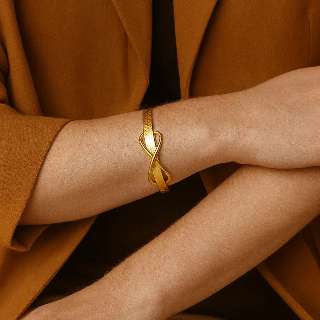 - Produktbeskrivelse : Dette armbåndet har en slående håndhamret tekstur med en elegant knutedetalj. Blandingen av glatte og teksturerte overflater skaper en dristig kontrast, noe som gjør det til et blikkfang med dyp symbolikk. Ingen størrelsesproblemer! Dette armbåndet justerer seg til håndleddet ditt for perfekt passform.