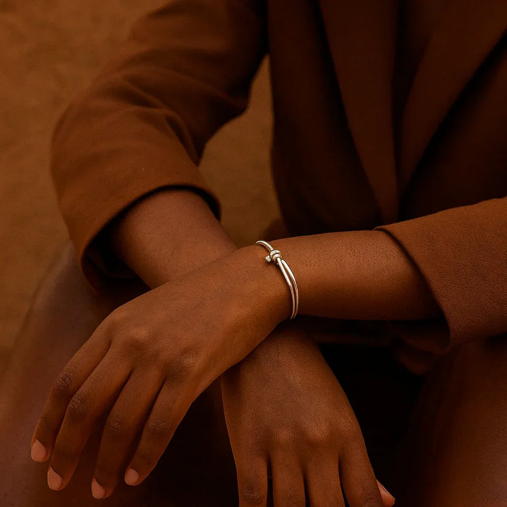 - Produksjonsbeskrivelse : Designet i Oslo og håndlaget i Senegal, har denne mansjetten en slående knutedetalj som symboliserer styrke og tilknytning. Ingen størrelsesproblemer! Dette armbåndet justerer seg til håndleddet ditt for perfekt passform.