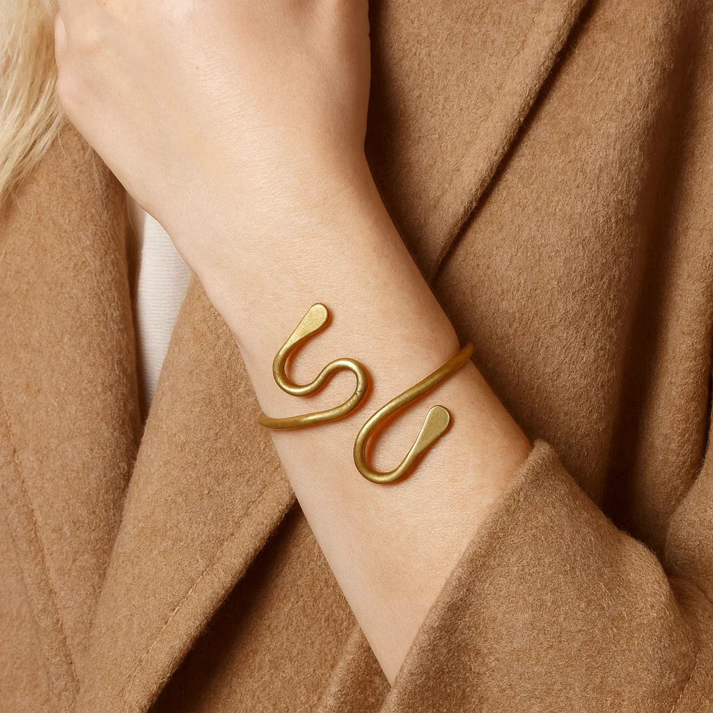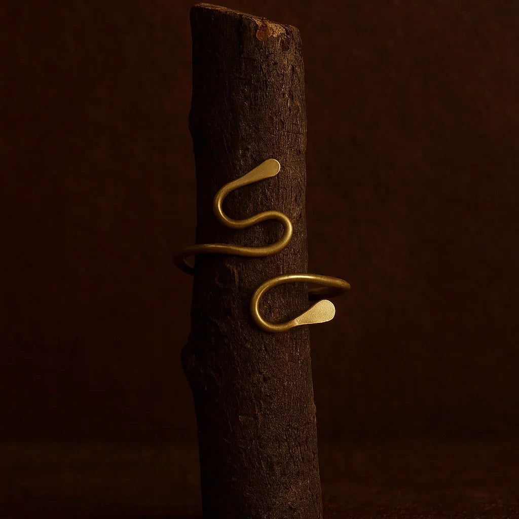 - Produktbeskrivelse: Dette dristige, svingete messingarmbåndet er inspirert av kurvene til en slange – et symbol på gjenfødelse og styrke over hele Afrika. Lett og enkelt å style.