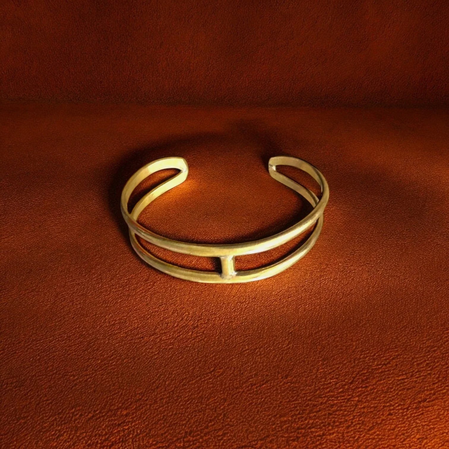 - Produktbeskrivelse : Minimalistisk, men dristig. Dette håndlagde kobberarmbåndet har et rent dobbeltbåndsdesign med en sentral stang som gir struktur og kant. Ingen størrelsesproblem! Dette armbåndet justerer seg til håndleddet ditt for perfekt passform .