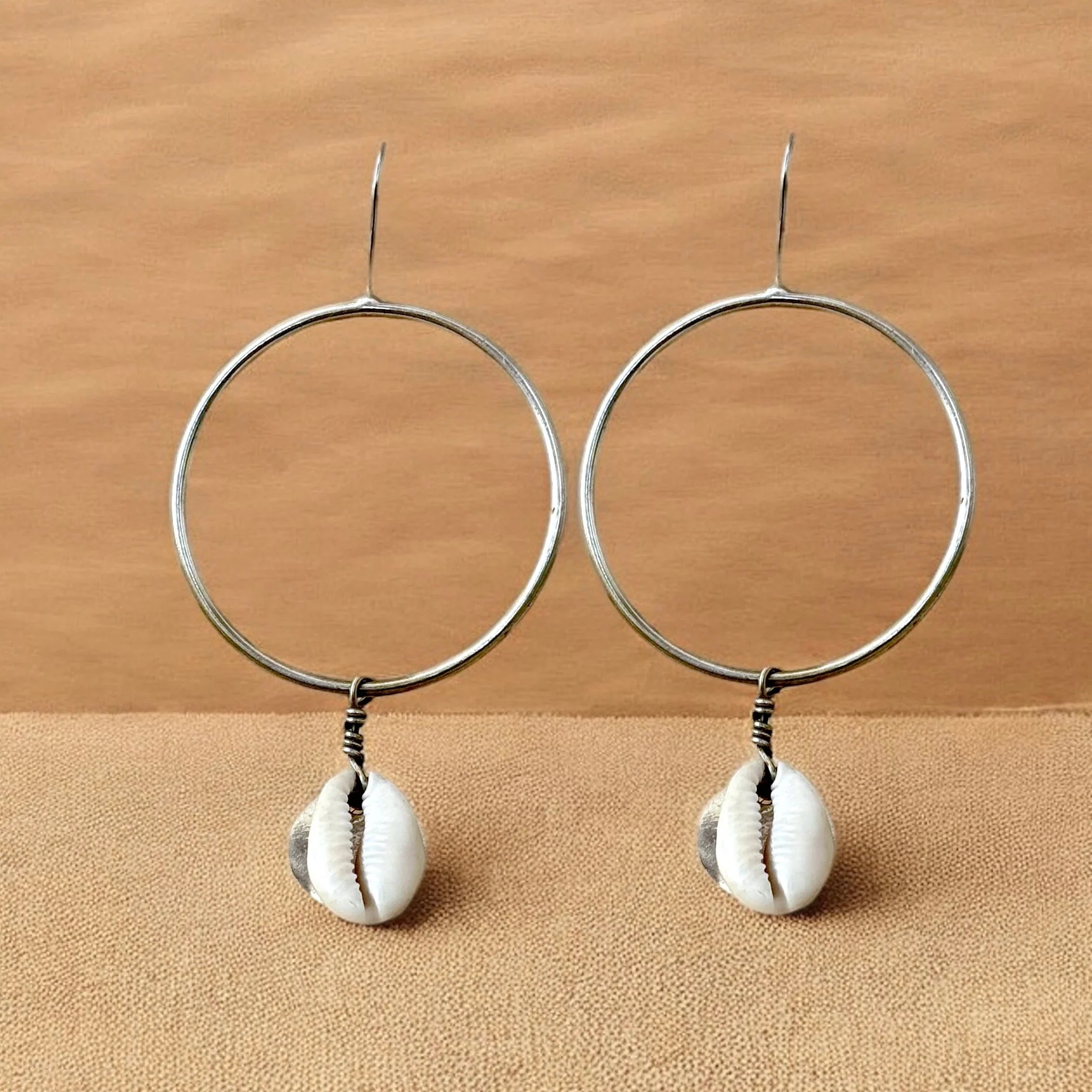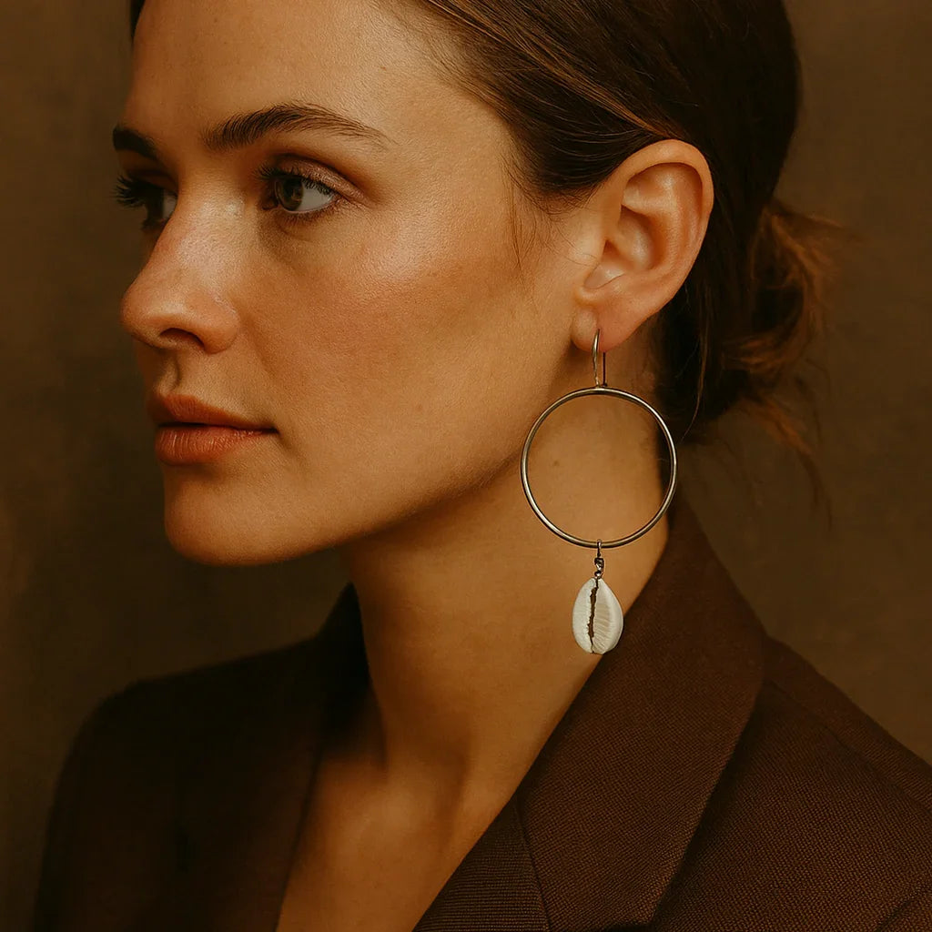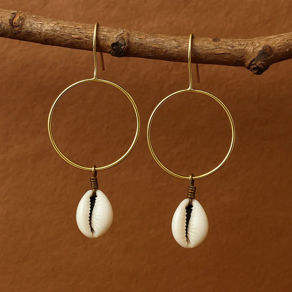 - Beskrivelse : Lett som vinden, forankret i historien. Kuma-øredobber blander elegante messingringer med hengende kauriskjell – tidløse symboler på havenergi, feminin kraft og velstand.