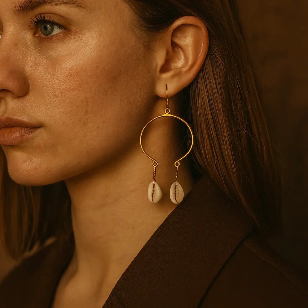 - Produktbeskrivelse : Disse dristige messingringene feirer kraften og symbolikken til kauriskjellet – en gang brukt som valuta og fortsatt sett på som et symbol på overflod over hele Vest-Afrika. Hver ørering har to naturlige kauriskjell hengende fra en polert messingring.