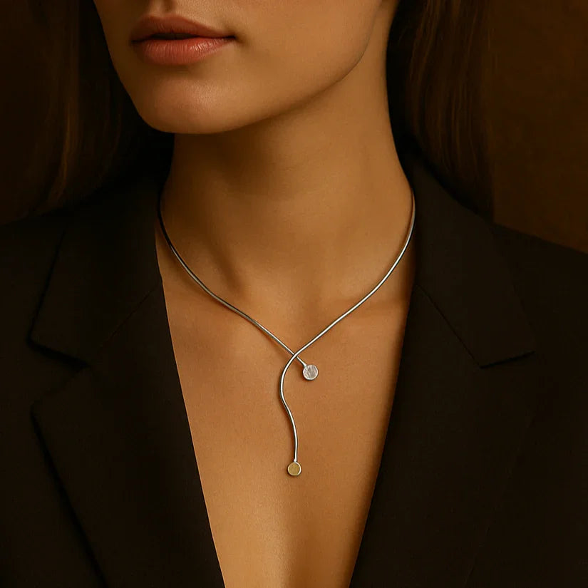 - Produktbeskrivelse : Dette halskjedet er et stivt choker-anheng. Det har et flytende, organisk design som etterligner den uanstrengte bevegelsen av vann. Den åpne strukturen, med sine subtile kurver, skaper et iøynefallende utseende som forblir lett og komfortabelt.