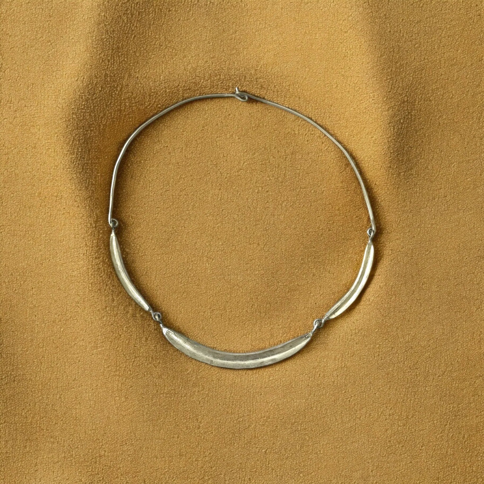 - Produktbeskrivelse : Dette stive halskjedet er formet som tre måneformede buer forbundet med en fin ramme, og leker med balanse og lys. Minimalistisk, men likevel skulpturelt, sitter det som en stille rustning rundt halsen din.