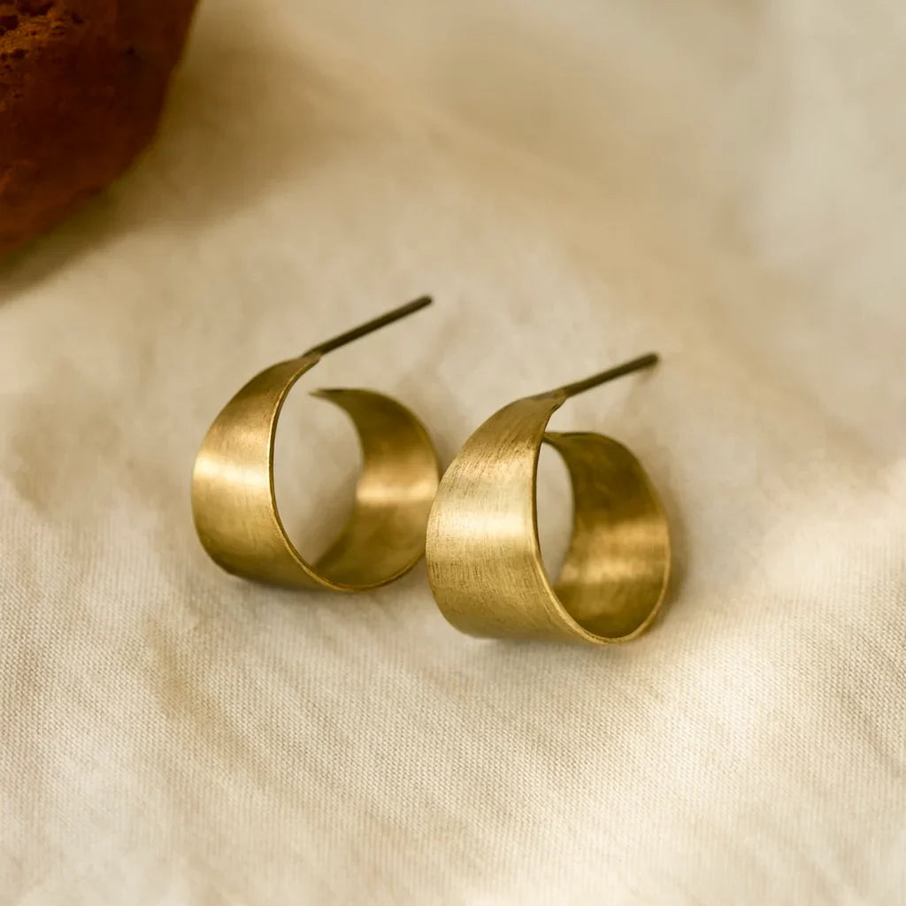 - Produktbeskrivelse : Disse håndlagde øredobbene er dristige og skulpturelle, og leker med kurver og skygger. Deres brede, åpne ringdesign gir et raffinert preg til ethvert antrekk. Minimalistisk med en vri.