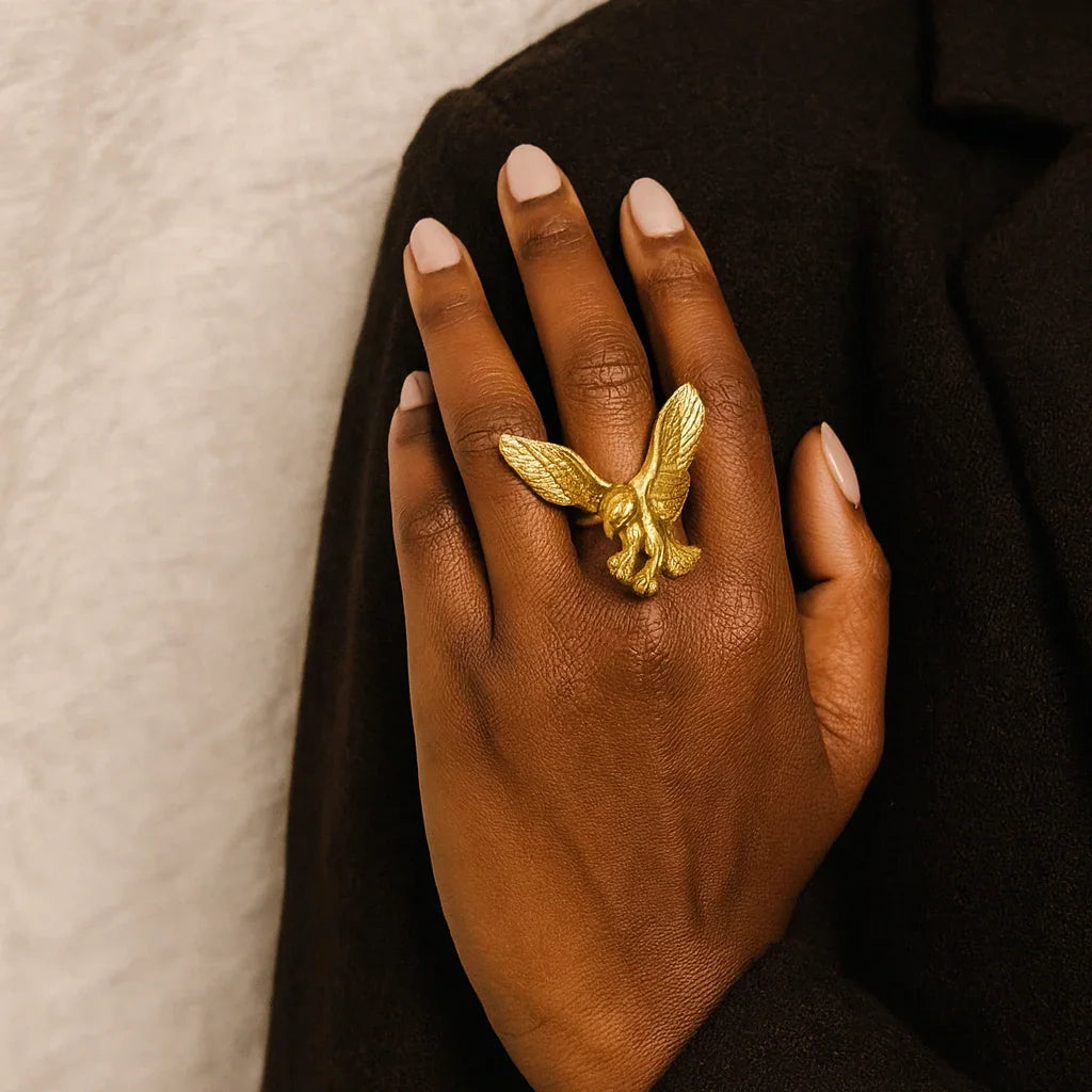 - Produktbeskrivelse : Awo-ringen fanger friheten ved å fly i messingform. En skulpturert fugl i bevegelse, detaljert med åpne vinger og glatt tekstur. Et stille blikkfang som symboliserer styrke og høyde.