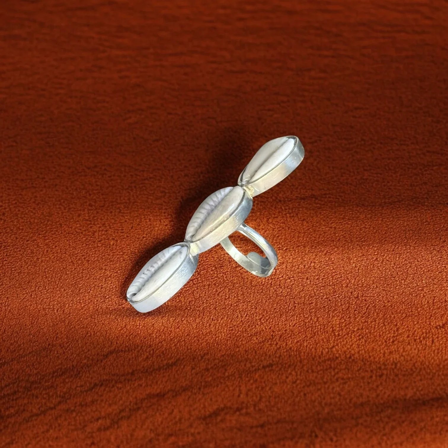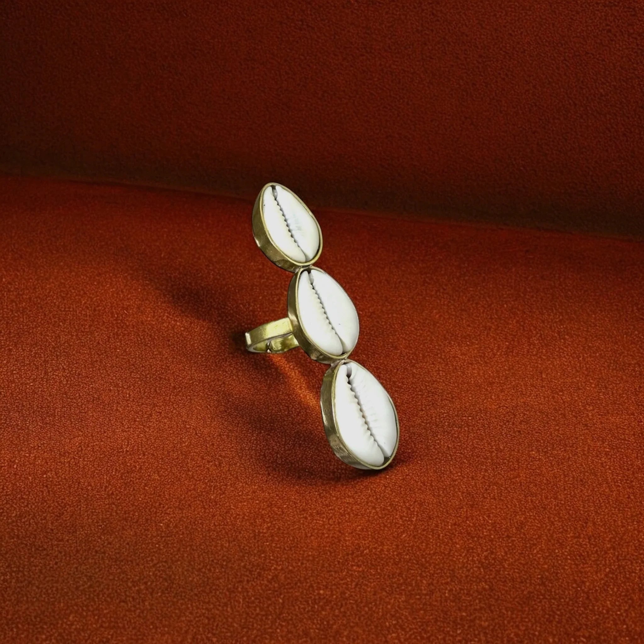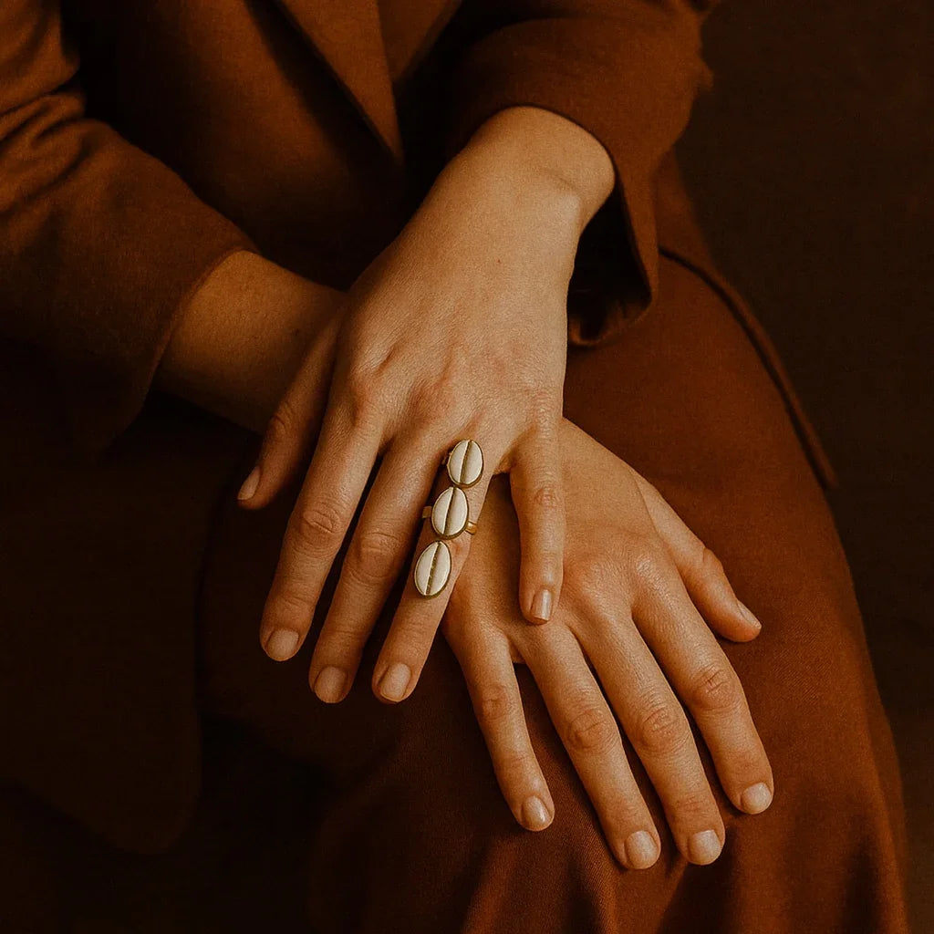 - Produktbeskrivelse: En messingring besatt med tre kauriskjell, en gang brukt som valuta og symbol på rikdom over hele Afrika. Lett og komfortabel, bærer dette smykket historie samtidig som det passer uanstrengt inn i en moderne stil.