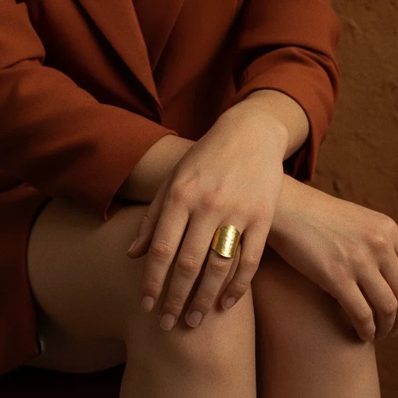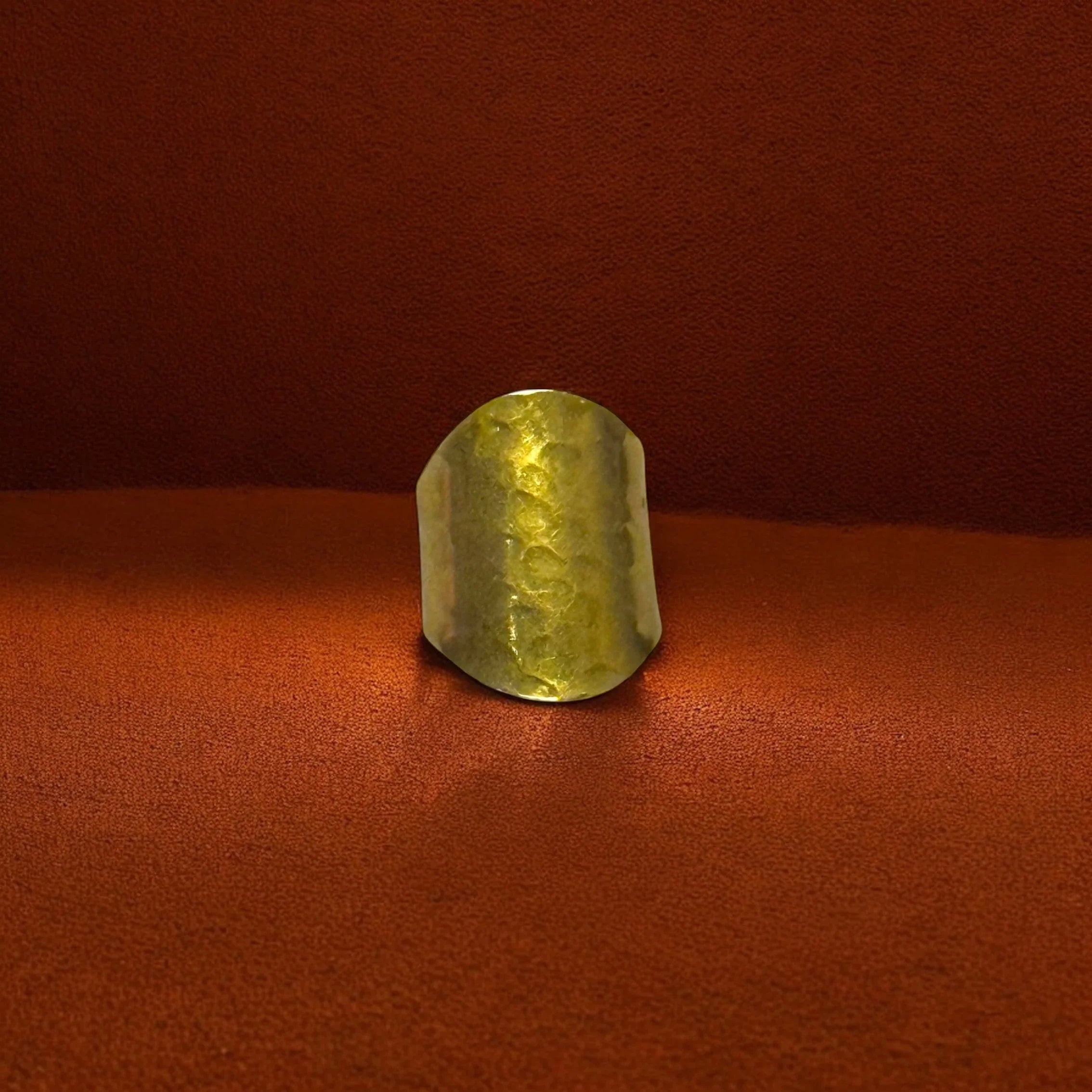 Betydning : Gaani betyr «feiring» på Baatonum, et språk som snakkes i Benin og Nigeria. - Beskrivelse : Denne messingringen er formet med et vinklet slipt snitt og hamret tekstur som fanger lyset fra alle vinkler. Gaani er dristig, men likevel minimalistisk, og gir en selvsikker touch til hverdagsantrekket ditt.