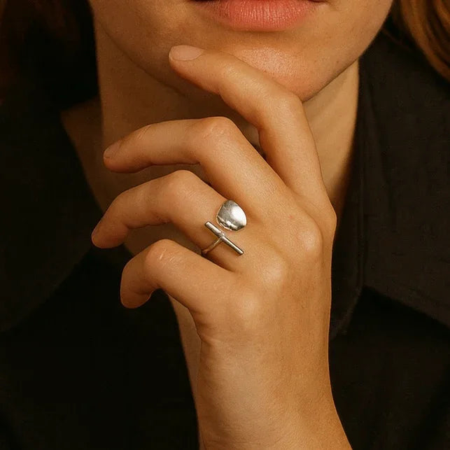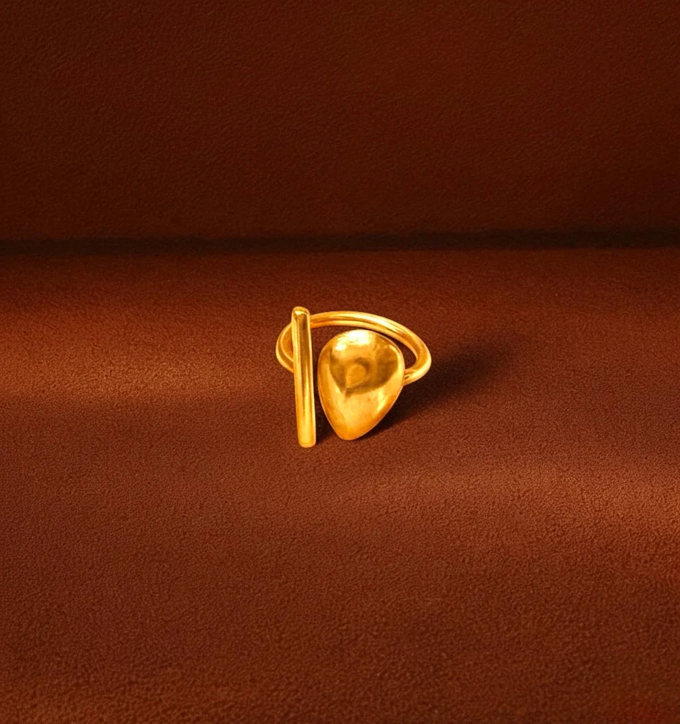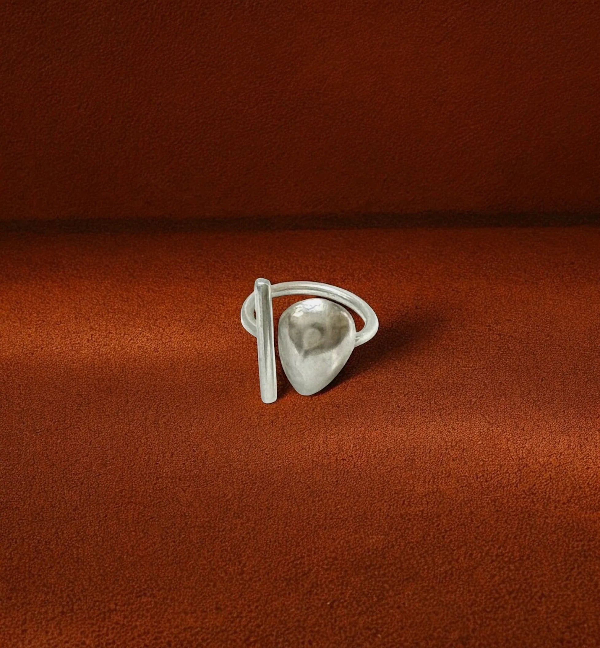- Produktbeskrivelse : Denne ringen er formet som en fallende dråpe og balansert med en minimalistisk stang, og er en ode til kontrast og ro. Den blander mykhet med struktur – perfekt for de som elsker subtile uttrykk.