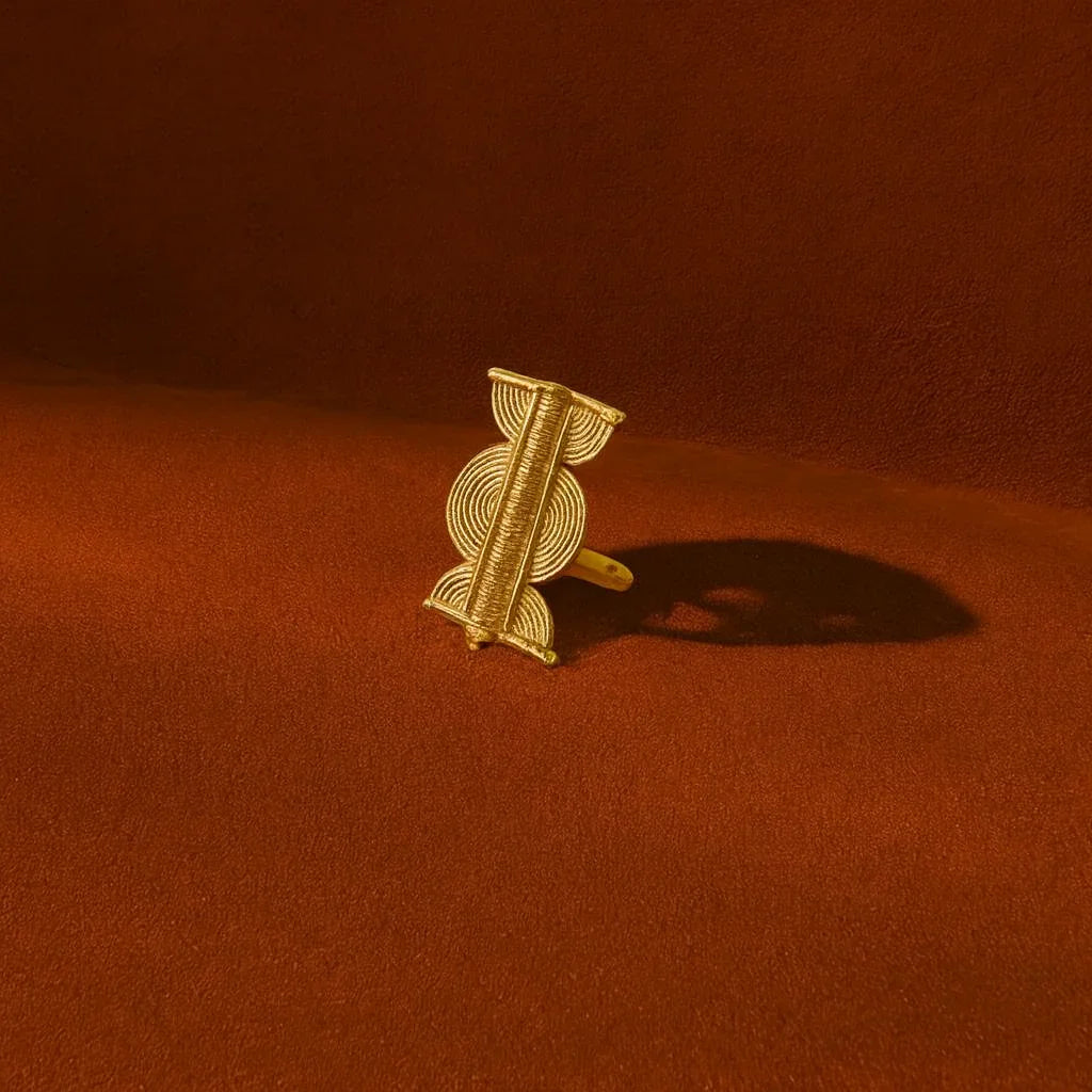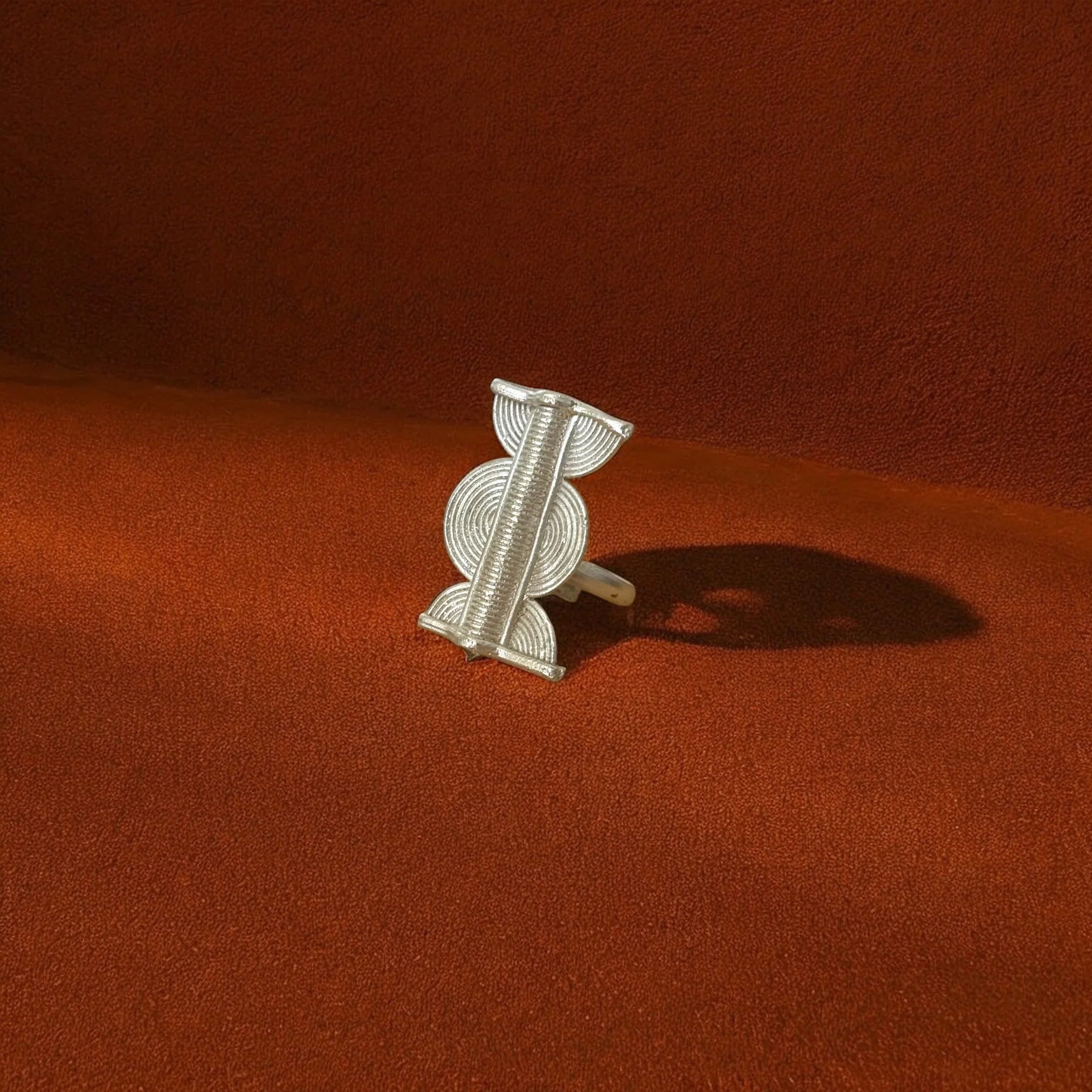 - Beskrivelse : Lóko er en høy ring – et symbol på styrke og struktur. Laget i sølvfarget messing med rene linjer og rytmiske kurver, bærer den energien fra forfedresøyler og hellig geometri.