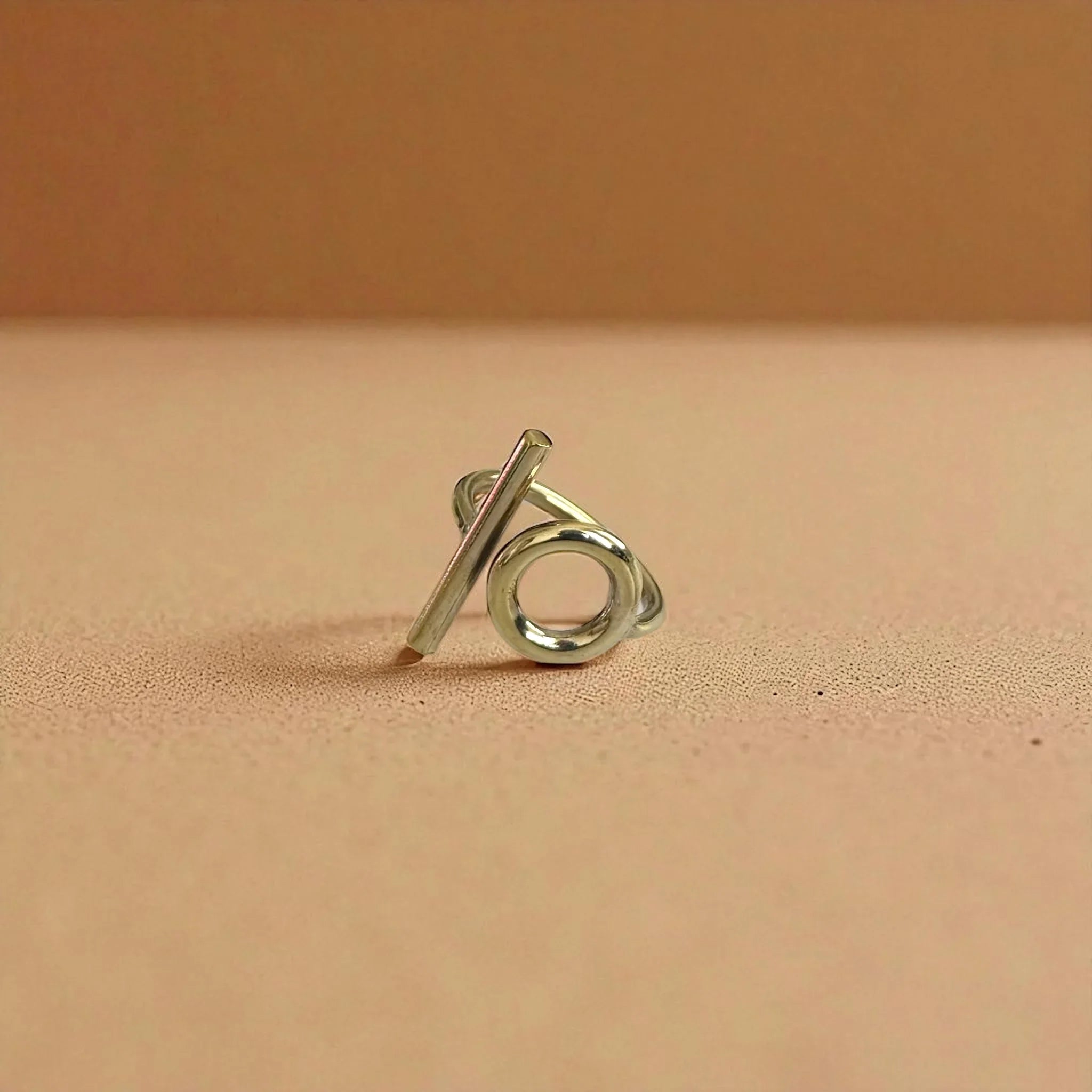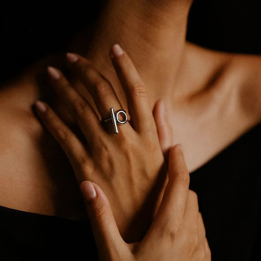 - Produktbeskrivelse : En dristig messingring formet med rene linjer, som balanserer en sirkel og en stang. Minimalistisk, men likevel kraftfull, den legemliggjør harmoni mellom struktur og flyt. Lett og komfortabel for hverdagsbruk.