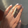 - Produktbeskrivelse : En skulpturell messingring med spiralformede linjer og en sideåpning som minner om sammenrullet pergament.