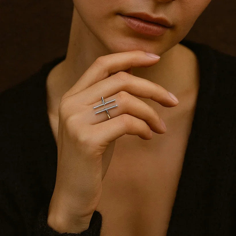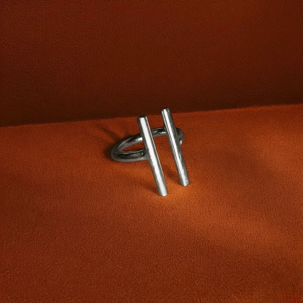 - Produktbeskrivelse : En minimalistisk ring med to vertikale stenger – som symboliserer harmoni, kontrast og stille kraft. Bruk den som en påminnelse om å holde deg jordet og sentrert.
