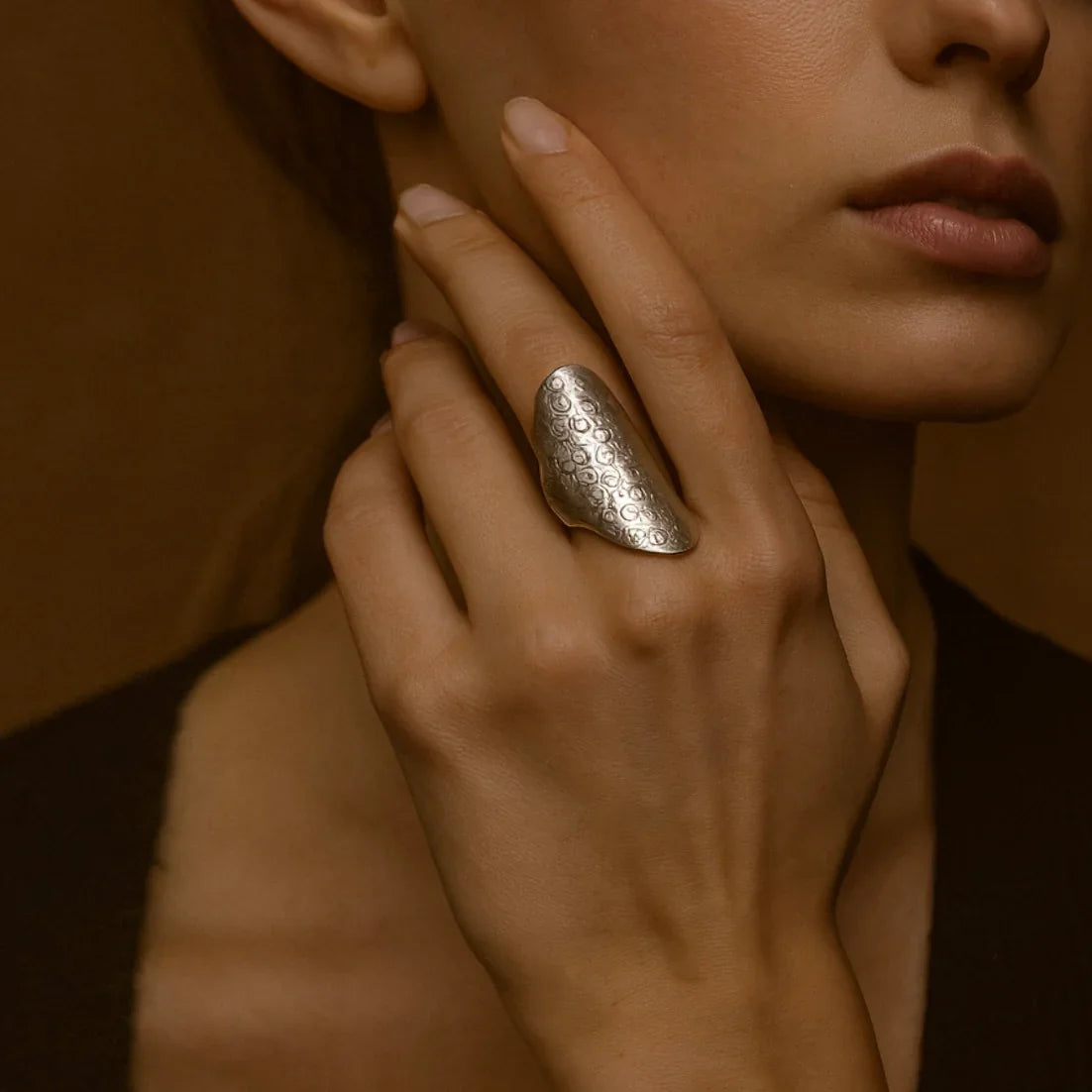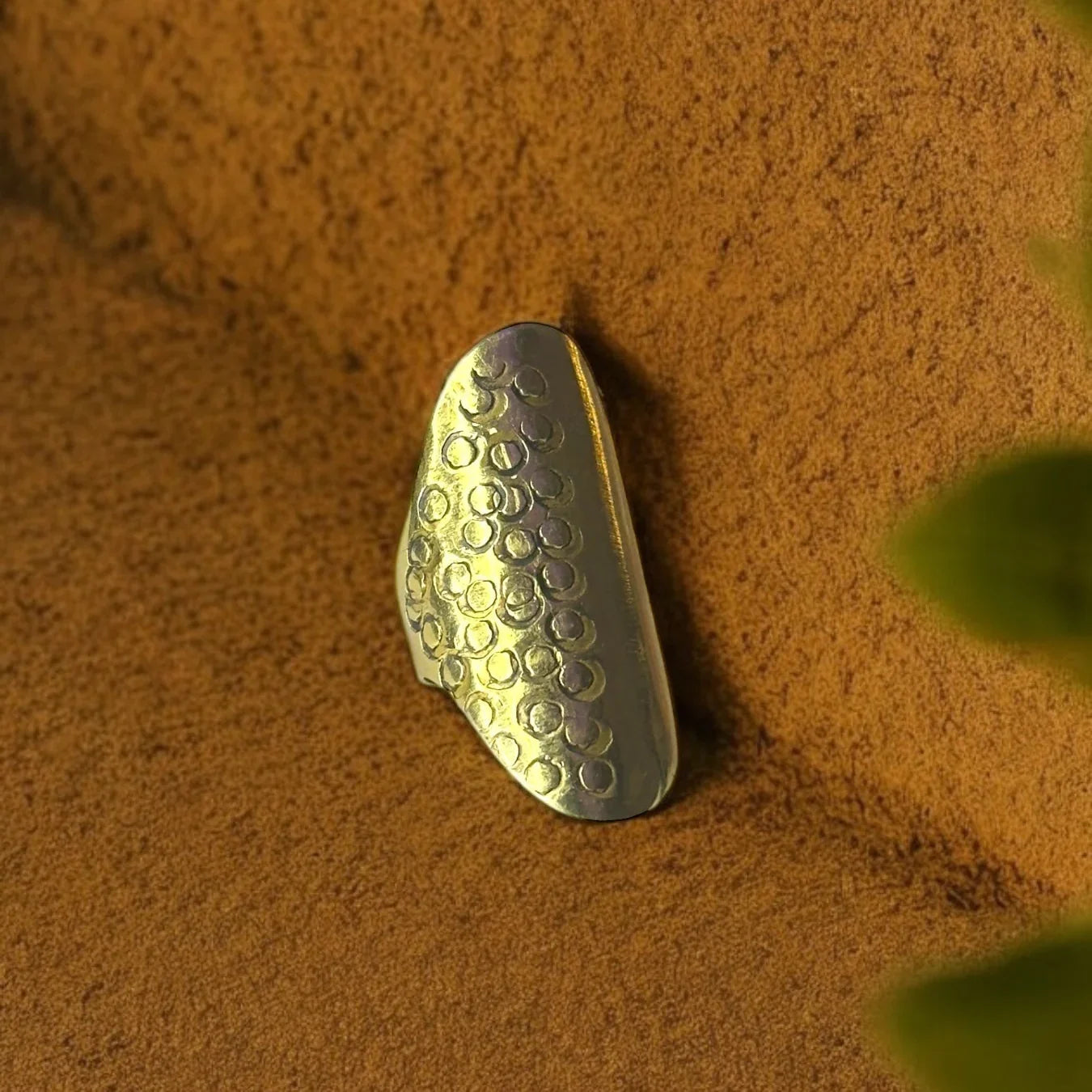 • Beskrivelse : Zama-ringen gløder med styrke og tekstur. Den er håndstemplet i messing, og den stigende formen og de sirkulære merkene reflekterer lys som spredte stjerner eller eldgamle symboler.