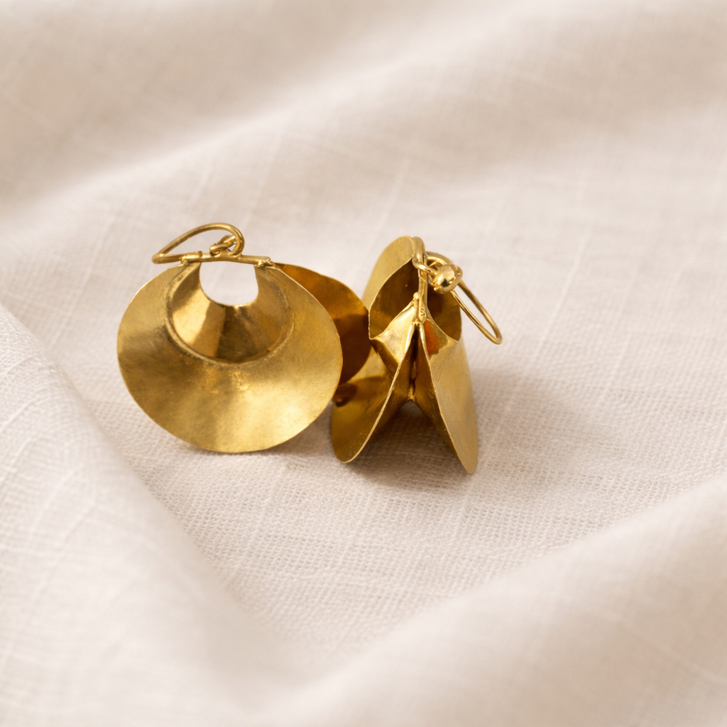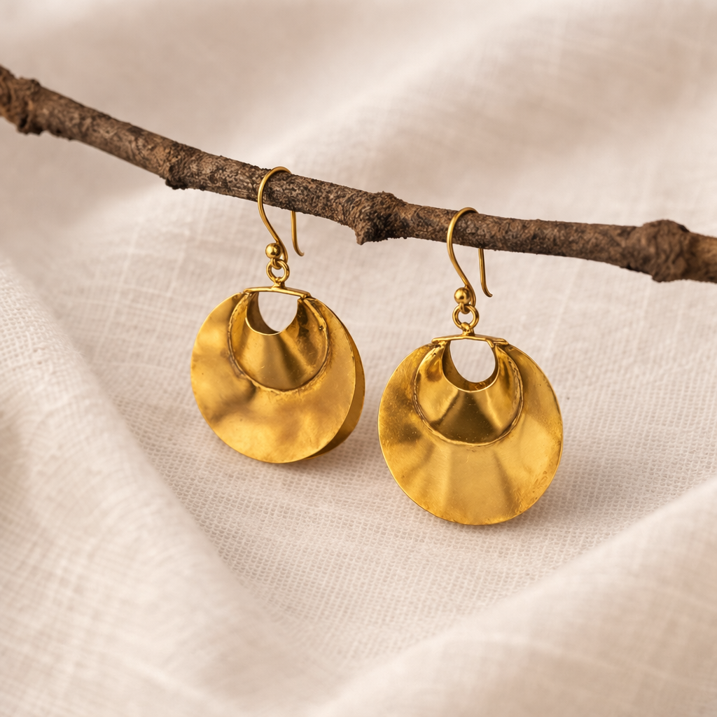 - Produktbeskrivelse: Zani-øredobbene er formet av lagdelte, håndhamrede messingplater som fanger lys med myk, skulpturell bevegelse.
