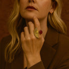 - Product Description: A statement brass ring set with a deep red stone, framed by dotted details and triangular carvings. Bold yet elegant, it carries the strength of tradition shaped into modern form.
